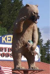 See a Giant Grizzly Bear with a Salmon in Crescent, Oregon. It is on top of a sporting goods store about 45 miles SW of Bend, Oregon on Hwy 97
